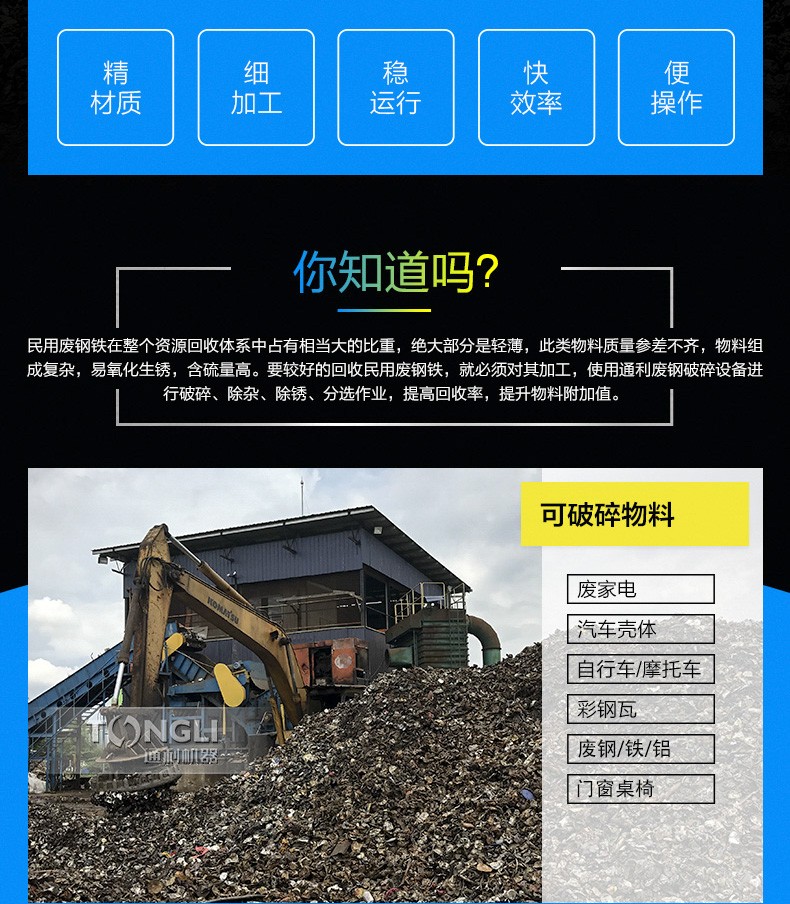 廢鋼破碎機是結(jié)合市場需求而成的產(chǎn)品。主要針對量廢棄金屬的再生利用,進行預(yù)破碎處理,并清理表面的油漆和污垢。該機產(chǎn)能每小時3T左右。