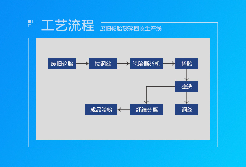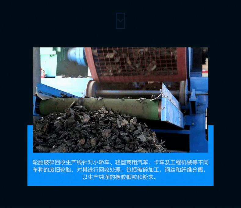 輪胎通過(guò)剔除纖維和金屬成分,經(jīng)研磨篩分而得到膠粉。再生膠粉廣泛應(yīng)用于體育場(chǎng)、防水卷材,公路改性瀝青,橡膠制品等領(lǐng)域。